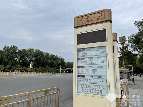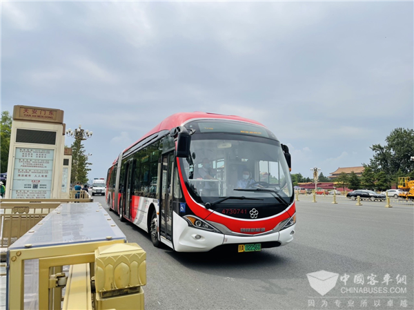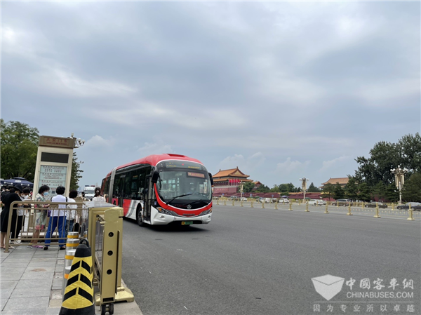 北京市中心,长安街中轴线上,天安门城楼巍峨矗立,这里是全中国人民都向往的地方,见证着中国民族走向伟大复兴的非凡历程。在天安门对向马路东侧公交站点外,一辆“中国红”涂装的铰接巴士由长安街自西向东驶来,远远看去,宛若一条灵动的海豚……