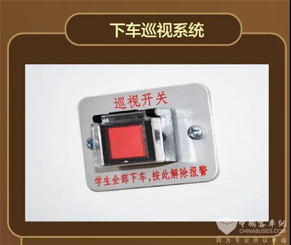 车辆熄火拔掉钥匙后,安凯校车驾驶舱内会自动发出“请巡视车厢”的提示,司机或监护人必须到车辆后部把巡视按钮按下才能消除提示,保证每一位学童的安全都能被及时照顾到。
