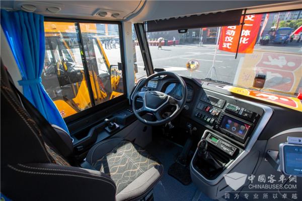 此外,宇通智慧校车独创整车智能自检,发车前进行车辆自检,识别油电气、灯光、空滤、制动器等状态是否异常等,提升行车安全;并采用行业首创的校车智能防遗忘系统,有效预防孩童遗留;360环视+MOD移动物体检测,显示车身周围全景影像,危险区域主动报警,避免碾压事故发生;车道偏离及碰撞预警、驾驶员疲劳预警等,也为校车安全运行营造了满满的科技感。