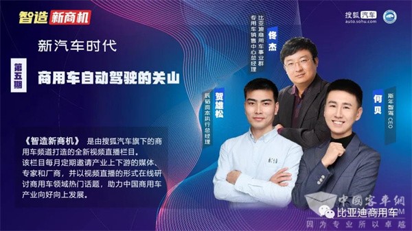 8月20日,由搜狐商用车打造的全新视频直播栏目——《智造新商机》,迎来第五期“新汽车时代,商用车自动驾驶的关山”专题探讨。本期特别邀请商用车自动驾驶赛道中的相关企业代表做客直播间,共同探讨商用车自动驾驶的现在与未来,推进自动驾驶长远发展。比亚迪商用车事业群专用车销售中心总经理佟杰参加本次直播。