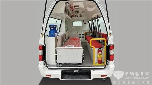 驾驶舱与医疗舱独立冷暖空调;驾驶座后安装隔音墙,与车身无缝连接,形成前后独立的驾驶舱与医疗舱,进一步防止交叉感染;医疗舱左右侧窗户分盲窗与明窗,左侧及后挡风玻璃粘贴2/3高度半透明膜,保护患者隐私;车上还配备了紫外线消毒灯、中心供氧接口等专业设备,令医务人员在有限的空间里发挥无限的能量救治更多患者。