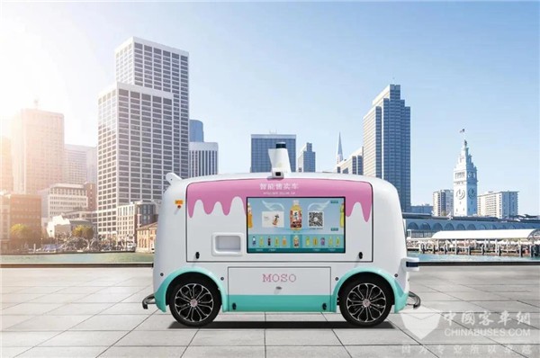 金龙MOSO自动驾驶售卖车,车辆能自动行驶、转弯、临停或绕行障碍物,可实现定点停车、固定路线巡航、预约停车等;可适应晴天、阴天、轻度雾霾、小雨等多种气候条件,在疫情期间为人们提供无接触的饮料、零食、便民物品的售卖服务。