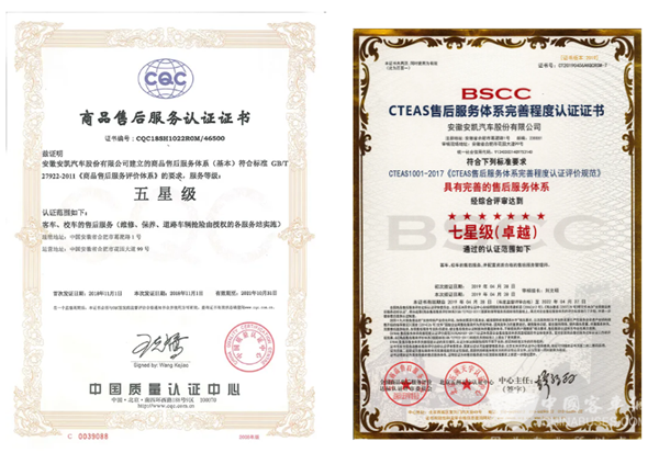 安凯客车售后服务体系在2018年首家获得中国质量认证中心(CQC)“五星级”售后服务认证,2019年再次获得CTEAS售后服务体系“七星级(卓越)”认证。一次次荣誉的取得,成为安凯在服务品牌建设上不断取得进步成果的印证,也成为中国客车行业服务体系新的飞跃的重要标志。