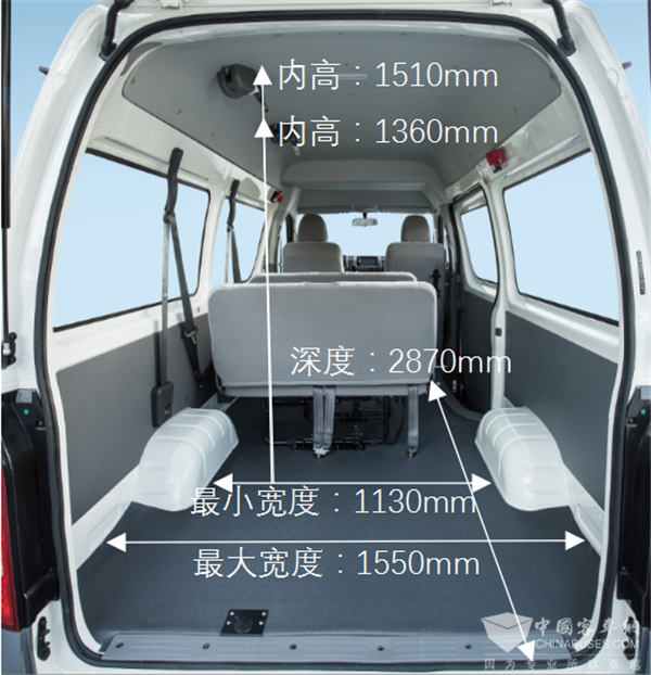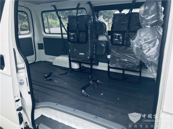 在车辆的内部,车的内长最高达2870mm,内宽最大达1550mm米,平顶车身内高达1360mm、高顶内高达1510mm,多样化车体空间可选,最大可达6.7m³,无论高载货空间还是下地库均可满足需求。