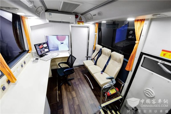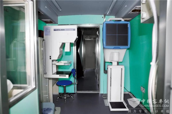 采用在售成熟车型改装,进行隔热、隔音、减震、降噪设计,配备紫外线消毒,空气消毒机等先进设备,可以做DR检查、胸透,心电,B超,生化检验、妇科检查等全科诊疗。配置有线局域网和5G无线网络,可实现体检结果数据自动汇总,打印报告;自动上传云平台,实现远程会诊。