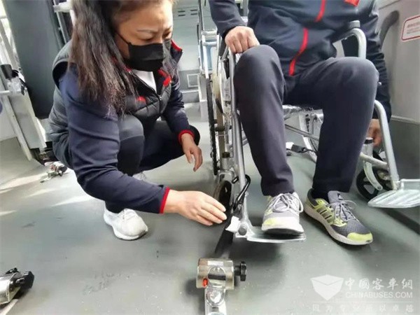 为保障残疾人运动员乘坐时的便携及舒适性,并达到防疫安全性要求,此次改制的福祉车突出四个核心功能。首先,拆除车厢中前部的座椅,改造成可同时搭载6辆轮椅的停放区,车厢后半部分则保留12个座椅供随队人员乘坐,使承载容量更大;其次,在轮椅停放区分别配备残疾人靠背、安全带、扶手以及用于固定轮椅的地锚,以保证残疾人乘坐安全性;其三,在车厢与驾驶室之间,专门安装防疫隔离板,隔离司机与乘客区域,实现人员分类管理;最后,每辆车还配备翻转踏板,用于连接车辆地板与站台地面,便于轮椅上下车。