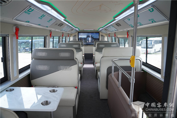 车内每一个能与乘客触碰处都做了软包处理,最大程度呵护乘客安全。进口木纹地板革,人体工学高靠背豪华软座,并配置USB充电接口,满足乘客充电需求。此外,到站提醒及景区风光介绍的高清大屏,带杯架独立办公桌,豪华造型中顶板,软包缝线工艺侧板,多彩氛围灯,车内专设无障碍乘车设施和轮椅区以及爱心专座,极大提升乘坐舒适体验。