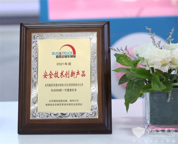 凭借出色的安全结构以及环保材质构建的健康体验,福田欧辉BJ6996新一代健康校车在2021北京国际道路运输展览“中国道路运输杯”上,荣获“安全技术创新产品”奖项,持续领跑国内校车产业。