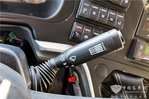 值得一提的是,除了疲劳监测DSM摄像头,在驾驶室区域能找到许多跟车辆行驶安全息息相关的配置。跟主动安全密切相关的可以看到电涡流缓速器开关,在下坡时让制动过程准确而舒缓,并降低了刹车盘的磨损,尤其是在山区道路比较多的旅游线路上提升了安全性。车侧位置配置了TPMS胎压监测观察窗,可实时检查轮胎胎压情况,确保车内人员安全。在这台车的仪表台上还能发现灭火启动报警开关和击窗器开关等被动安全配置。