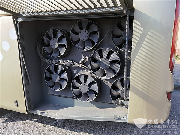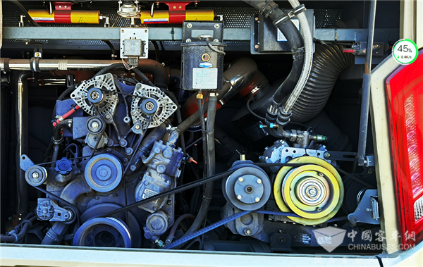 打开车辆后舱盖可以发现足足有多达三个发电机,而通常车型的发电机数量只有两个。金旅新凯歌特别为液缓单独配备了一个独立发电机,在车辆电涡流缓速器介入时,不会对车内空调等设备的工作稳定性造成影响,确保车上成员的舒适度始终如一。