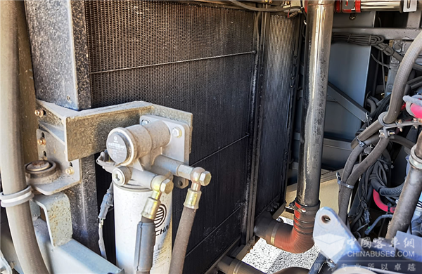 其实这套系统不仅仅是节能降噪,它还有着诸多功效。我们可以看到散热器表面少了不少通常机械式风扇堆积起来的灰尘杂物,由于电子风扇是电子智能调速和对外抽风,避免了散热器里的杂物积聚,降低了散热器的维护成本,同时提升了发动机的效率。另外由于这种散热器侧置的布局,为发动机让出了更大的空间和距离,更加方便发动机的保养和维修。