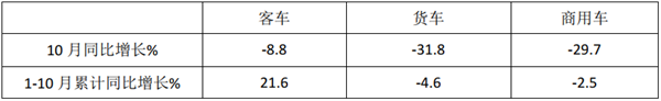 根据中汽协数据,2021年10月及1-10月客车、货车、商用车同比增幅比较: