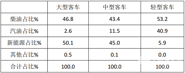●新能源大型客车占比过半,柴油在轻型客车中占比达53%
