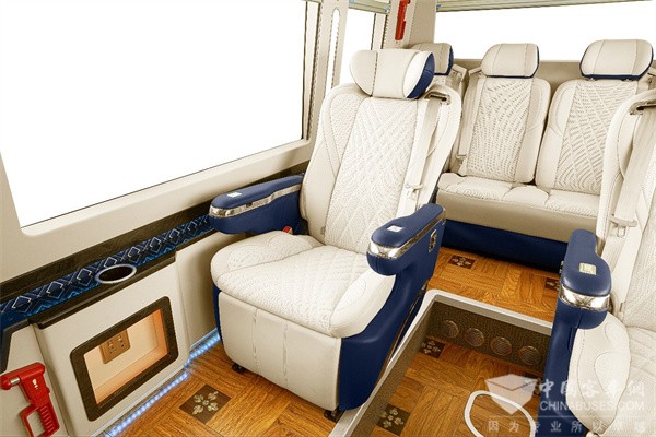 星空顶融合多层氛围灯,彰显最高级别礼遇;艺术拼花柚木地板,极富典雅时尚品味。整体蓝白拼色内饰,层次分明,搭配侧围蓝底白线回形纹刺绣,引领高端商务潮流,带来视觉与触觉的双重享受。
