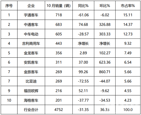 宇通占有率第一 中通/中车争第二 10月大中型新能源客车销量同比下降31.35%