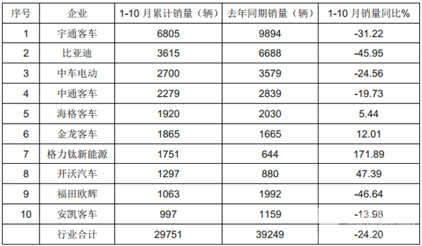 ●1-10月新能源客车销量: 宇通稳居榜首,格力钛新能源大涨171%,5家企业实现同比正增长