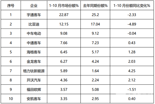 从上表看出,2021年前10月新能源客车Top10中市场份额变化特征是: