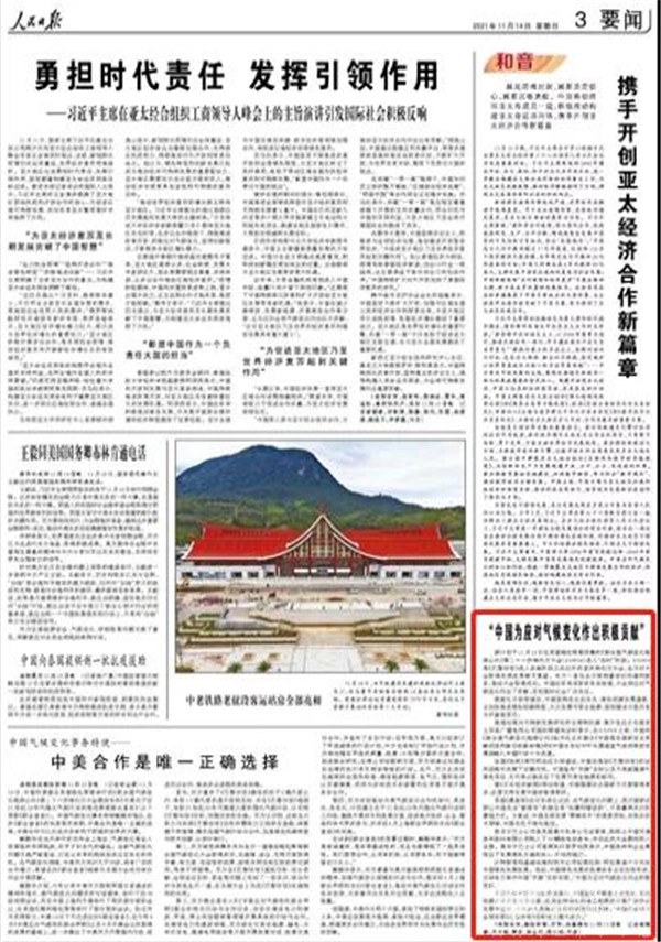 2021年11月14日,人民日报以“中国为应对气候变化作出积极贡献”为题,报道中国为应对全球气候变化作出的务实贡献,在第二十六届联合国气候变化大会(COP26)上受到国际社会的赞赏。