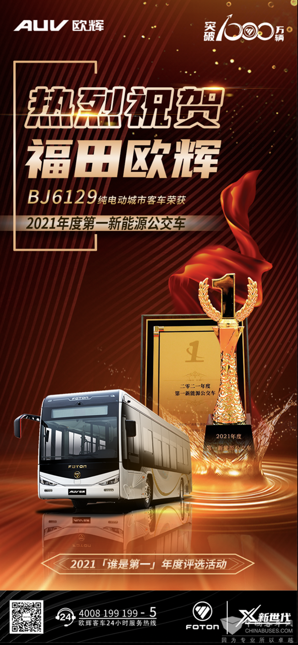本次福田欧辉BJ6129纯电动城市客车喜获“2021年度第一新能源公交车”殊荣,是业界和用户对福田欧辉的肯定和褒扬,也是自身实力的再一次证明。未来,期待更多欧辉绿色新能源车型穿梭于祖国青山绿水、城市大街小巷之中,助力推动城市绿色公交的提质增效。