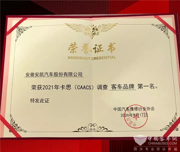 2018年安凯客车获得中国质量认证中心(CQC)“五星级”售后服务认证,2019年获得CTEAS售后服务体系“七星级(卓越)”认证,2021年又荣获中国汽车售后服务客户满意度调查(卡思调查)“客车品牌第一名”。一次次荣誉的取得,成为“安凯大家园”服务品牌建设不断进步的印证,彰显了企业强大的售后服务保障体系能力。