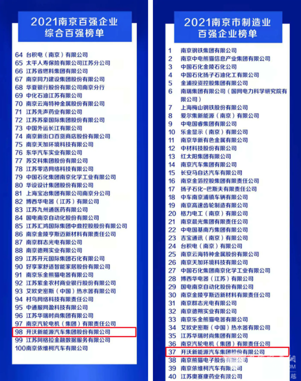 近日,南京市企业联合会、南京市企业家协会发布了2021年南京市企业百强榜单。开沃新能源汽车集团股份有限公司(以下简称“开沃汽车集团”)凭借卓越的综合实力、高品质的产品体系等,荣登2021南京市企业综合百强榜单、制造业百强企业榜单。