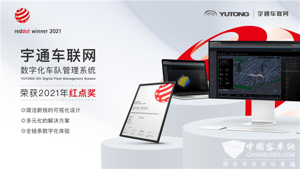 今年11月,凭借“车联网数字化车队管理系统”,宇通客车荣获“2021年红点品牌与传达设计大奖”,成为国内首家客车数字化解决方案获此殊荣的公司。