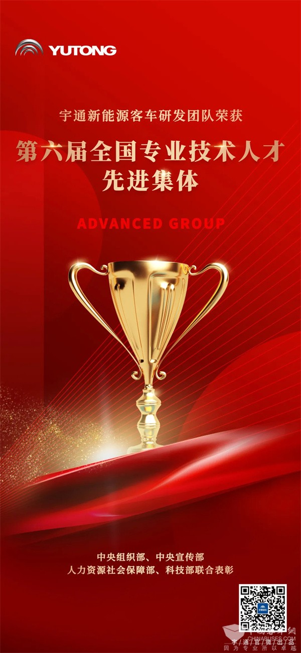 不久前,第六届全国杰出专业技术人才表彰大会在北京举行。会上,中央组织部、中央宣传部、人力资源社会保障部、科技部联合表彰了93名全国杰出专业技术人才和97个全国专业技术人才先进集体。其中,宇通新能源客车关键技术研发及产业化研发团队荣获“全国专业技术人才先进集体”称号。