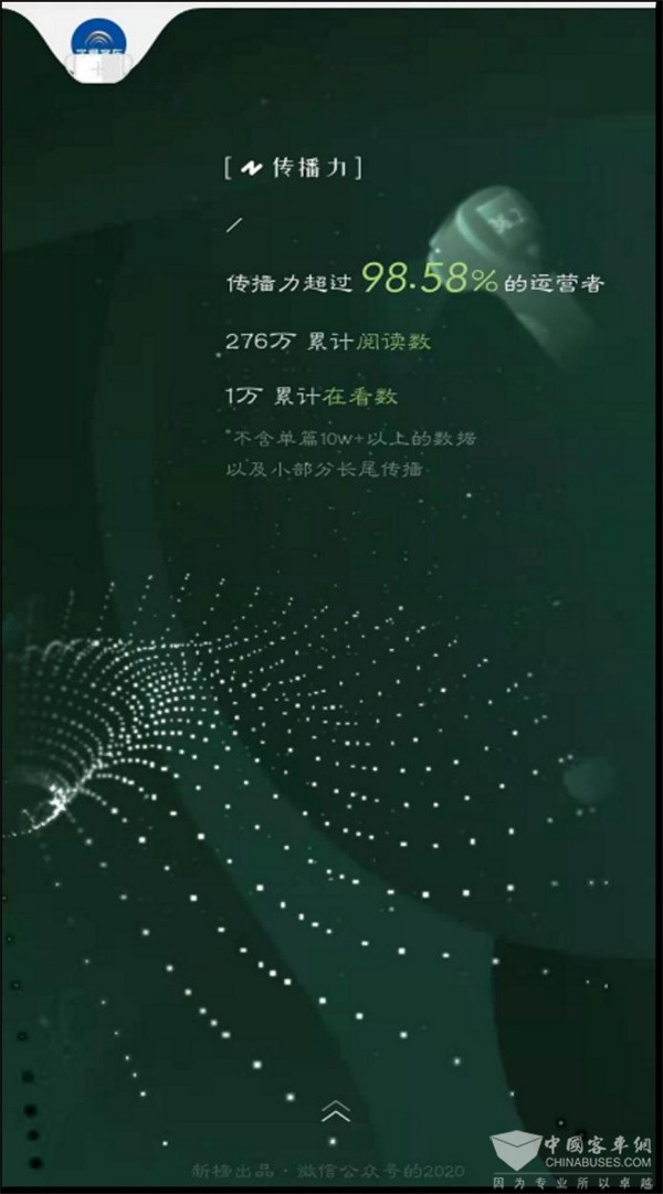 通过宇通客车新媒体矩阵的发声,让更多的人看到宇通、认识宇通并了解宇通。同时,宇通客车也得到了平台官方的认可。在抖音平台官方发布报告中,宇通账号的各项数据领先其他300+客车品牌;在新榜微信传播力排名中,宇通曾4次超越知名汽车品牌,位居排名汽车制造企业第一名,传播力超越了98.58%的运营者。