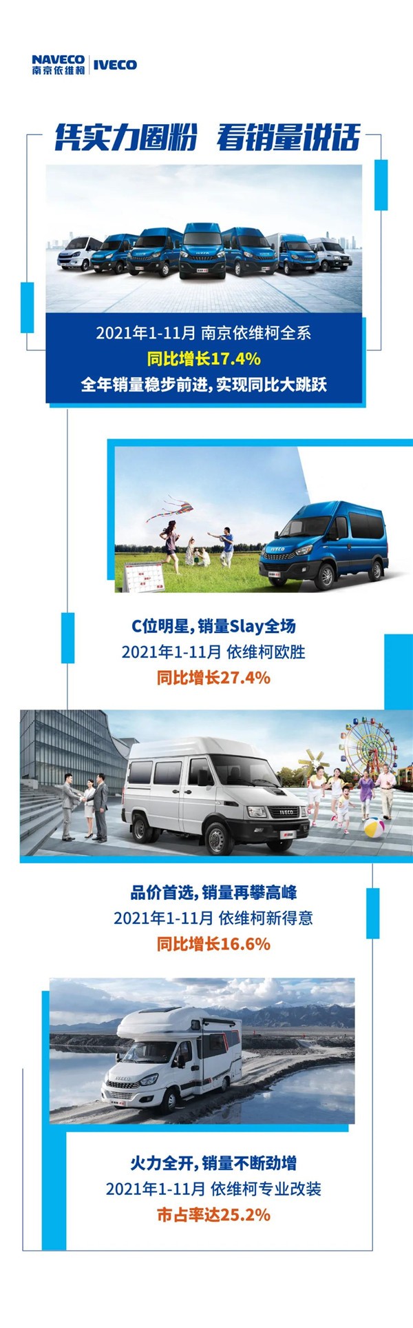 持续发力,乘势而上。2021年,南京依维柯产品市场表现可谓是“势不可挡”。根据数据显示,1-11月全系同比增长17.4%,依维柯专业改装,更是火力全开,销量不断劲增,市占率高达25.2%。其中,C位明星依维柯欧胜,销量slay全场,同比增长27.4%;品价首选依维柯新得意,销量再攀高峰,同比增长16.6%,其全年销量稳步前进,实现同比大跳跃,引发业内与消费者广泛关注。