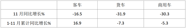上表显示,今年11月客车销量同比下降16.5%,商用车大盘今年11月同比下降30.3%,客车降幅显然小于商用车;今年1-11月客车市场累计同比增长16.9%,也跑赢今年1-11月商用车大盘(-5.3%)。也就是说无论是今年11月还是1-11月,客车市场均跑赢商用车大盘。