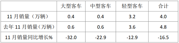 上表可见,11月客车总销量为4.0万辆,同比下降16.5%。细分车型上,大型客车销量0.4万辆,同比下降32.0%,是下降幅度最大的细分车型,说明大型客车表现依然是最为惨淡的车型;中型客车销量0.4万辆,同比下降22.9%,也跑输客车大盘,表现也不太理想,但降幅相对大型客车要温和一些;轻型客车销量3.2万辆,同比下降12.9%,是销量最大、同比降幅最小的细分车型,也是今年以来同比连续第三次下降的月份(第一次是9月份,第二次是10月份)。