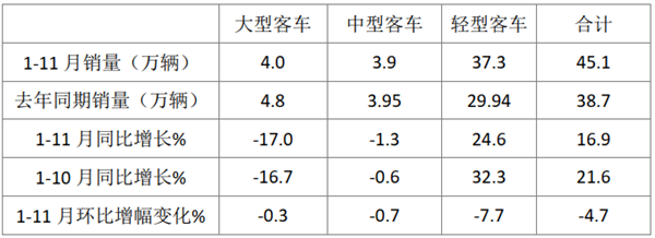 ●1-11月客车累计销售45.1万辆,同比增长16.9%,同比增幅比1-10月收窄4.7%