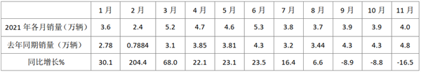 根据中汽协数据统计,2021年1-11月各月客车销售同比增幅: