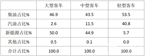 ●1-11月按发动机搭载的燃料种类划分,新能源在大型客车占比最大,柴油轻型客车是主力