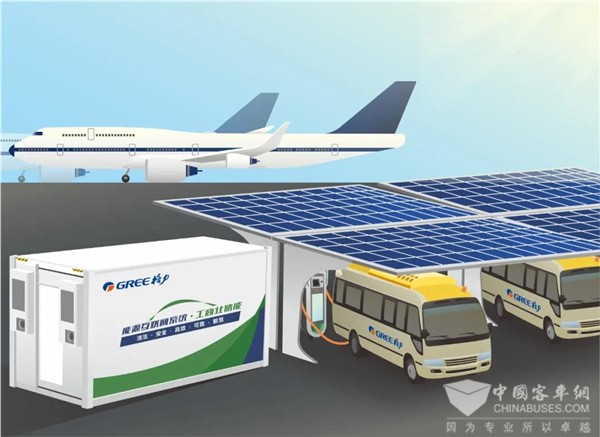 在储能领域上,基于高安全、大倍率、耐宽温的格力钛电池,格力钛研发出满足机场运营需求的“光储充一体化”智慧能源系统,利用机场宽阔无遮挡环境,格力钛储能系统、充电桩车棚顶棚光伏板系统和大功率直流快速充电桩组成光储充一体化电站,对机场电网进行可再生资源增容。