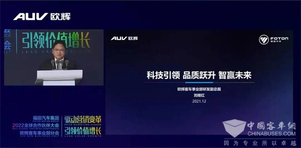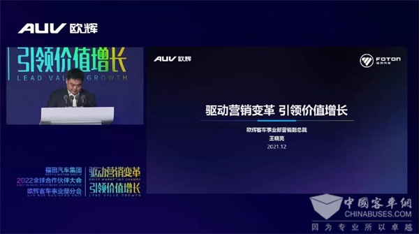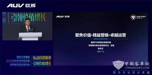 作为中国客车行业的领军品牌,福田欧辉始终坚持创新发展,与全球合作伙伴合力不断创造辉煌。会上,福田汽车集团业务副总裁、欧辉客车事业部党委书记、总裁梁兆文发表主题为《聚焦价值·精益营销·卓越运营》的战略发展报告。报告中,梁兆文对2021年国内大中客车市场运行情况进行总结,重点分析目前所面临的市场环境,并对2022年欧辉客车的目标策略和重点工作进行深入剖析和系统安排。