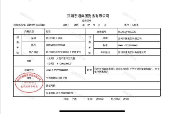 自救同时援助社会 宇通集团向郑州捐赠1000万元