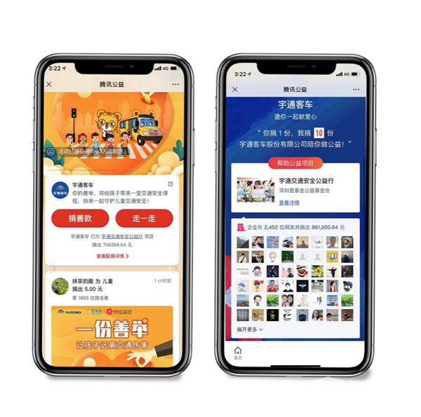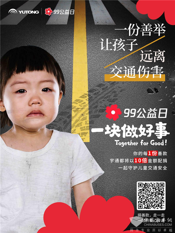 99公益日来临之际,宇通联合腾讯发起99公益日活动,以“您捐1块,宇通捐10块”的呼吁方式,号召2452位爱心人士参与,筹集861000.64元,助力推动儿童交通安全教育普及。