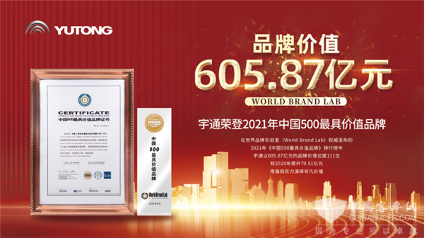 在世界品牌实验室(World Brand Lab)权威发布的2021年《中国500最具价值品牌》排行榜中,宇通以605.87亿元的品牌价值位居111位,较2020提升80亿元。