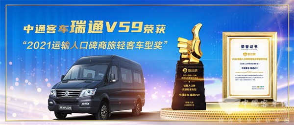 2021年1月7日,中通客车高端宽体轻客——瑞通V59再获权威认可。2021运输人口碑商用车及零部件评选活动的获奖名单正式揭晓,瑞通V59凭借卓越的产品品质荣获“2021年度运输人口碑商旅轻客车型”荣誉。