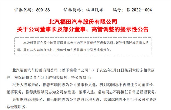 2022年1月11日,福田汽车(SH600166)发布公告,其于当日接到大股东相关函件,根据大股东来函,推荐常瑞为公司董事长人选,巩月琼不再担任公司董事长、董事职务;推荐武锡斌为公司总经理、董事人选,常瑞不再担任公司总经理职务。另外,根据总经理提名,崔士朋为公司副总经理人选,武锡斌不再担任公司常务副总经理职务。