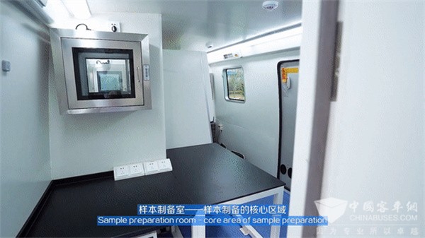 中通核酸检测车工作区分为四室四门,独立分区,梯度负压控制,确保气流单向流动,样本通过专业的传递传递窗传递,防止病毒泄露。采用门互锁防护机制,避免双门同时打开可能造成的交叉污染;设置高压灭菌锅、洗手眼装置等,完成废弃物灭菌。同时,配置先进的污水处理系统,防止污染环境。