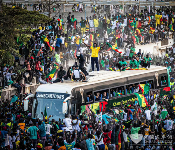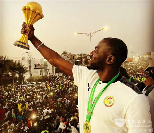 2022年2月7日,在非洲国家杯男子足球决赛中,由马内领军的塞内加尔通过点球大战4比2击败七冠王埃及队,历史上首次夺得非洲国家杯冠军。赛后,塞内加尔举国欢庆,塞国总统也取消当日外访行程,亲自到机场迎接运动员回国,宣布全国放假一天来庆祝胜利,当天所有球员乘坐的车辆正是苏州金龙海格KLQ6123K豪华大巴。海格客车载着球员们感受着球迷们的喜悦与激情,一路全程护航。