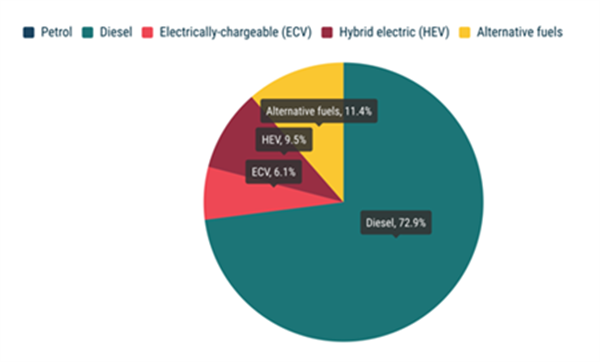 2020年欧洲新生产客车能源类型占比