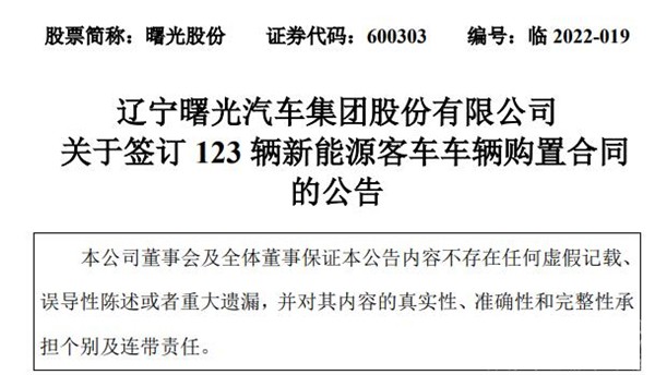 2022年3月4日晚间,辽宁曙光汽车集团股份有限公司(简称“曙光股份”)发布关于签订123辆新能源客车车辆购置合同的公告。近日,曙光股份子公司丹东黄海汽车公司在在丹东公交公司的100辆 10.5米级纯电动空调公交客车和23辆11米级旅游造型纯电动空调公交客车采购项目中中标,并与丹东公交公司签订了100辆和23辆纯电动空调公交客车的《车辆购置合同》,合同总金额10733.85万元。