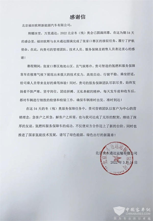 在本届冬奥会中,福田欧辉的氢燃料客车表现也极为抢眼,氢动力科技服务有限公司在感谢信中讲到:欧辉研发并投入服务保障任务的氢燃料电池客车,凭借先进的技术水平、舒适的乘车环境,智能的驾驶系统获得司乘人员的衷心点赞,在此次接驳任务中充分展现了中国“智”造的魅力,出色的完成了冬(残)奥护航使命。