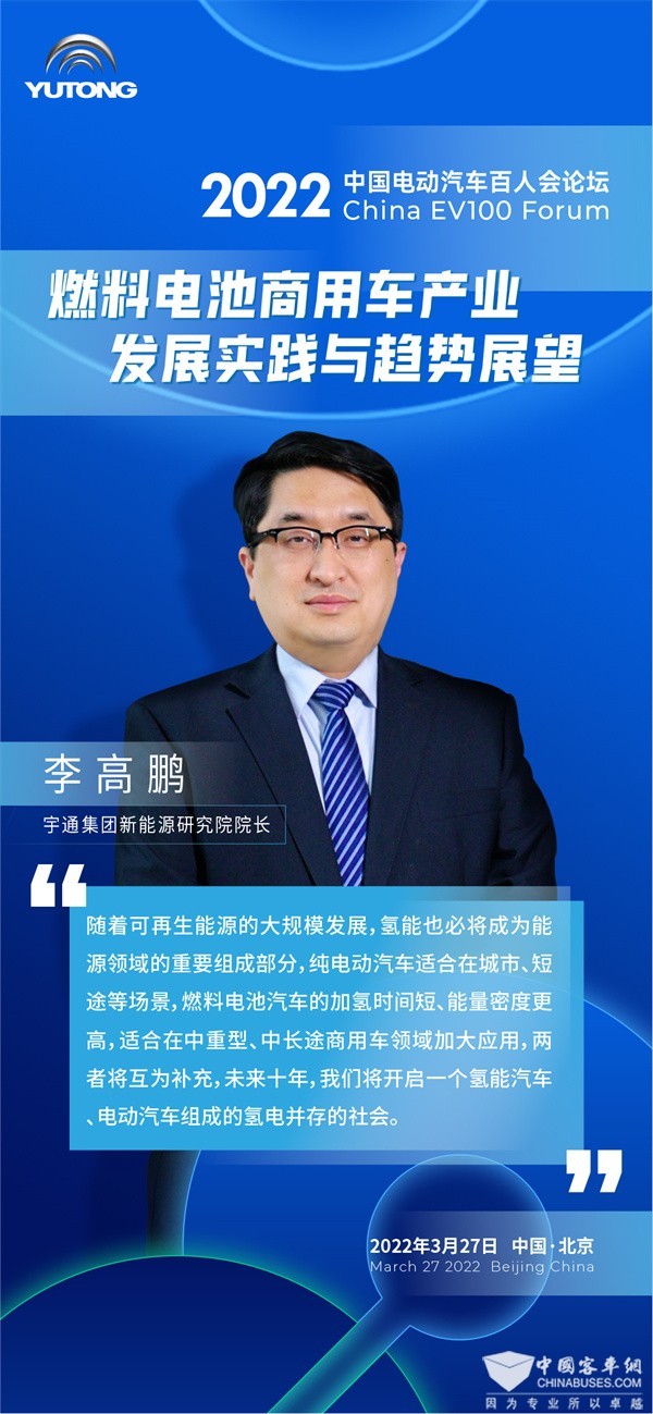 2022中国电动汽车百人会论坛期间,宇通集团新能源研究院院长李高鹏以《燃料电池商用车产业发展实践与趋势展望》为主题发表演讲,宇通客车旗下自动驾驶氢燃料客车隆重亮相论坛展区,全面展示了宇通在氢燃料客车领域的研发与应用实力。