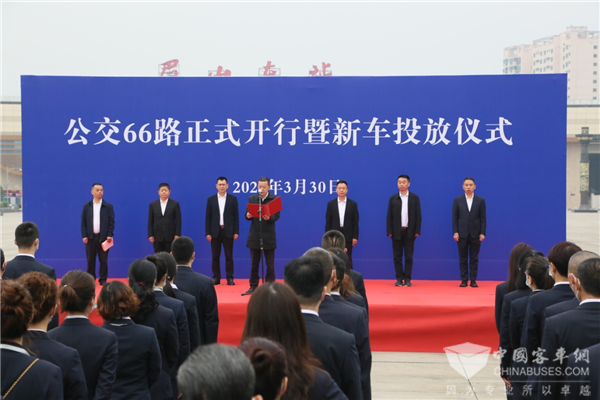 2022年3月30日上午,四川眉山市展通公交客运有限公司在眉山东站举行66路公交正式开行暨新车投放仪式,14辆宇通“宇威“造型高端纯电动车整装待发,将为该线路沿线市民带来更加美好、舒适、安全的乘坐体验。眉山市政府副市长邹汝林出席投运仪式并宣布公交66路正式开行。