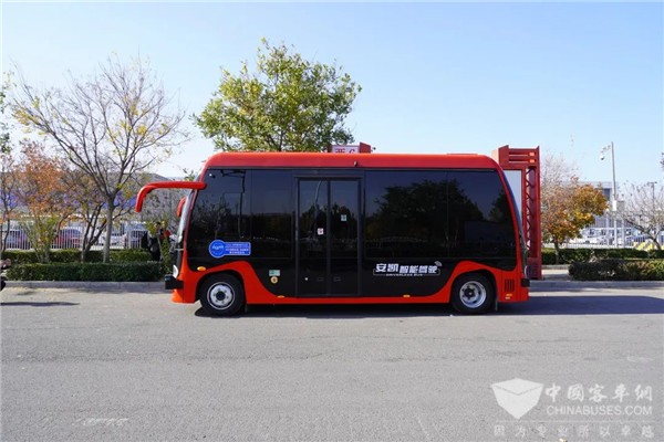 安凯无人驾驶客车小巧灵动,线条流畅,造型设计极具科技感与未来感。