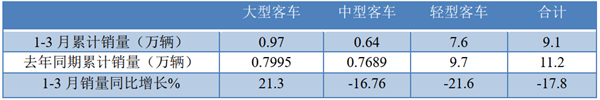 1-3月客车总销量为9.1万辆,累计同比下降17.8%;